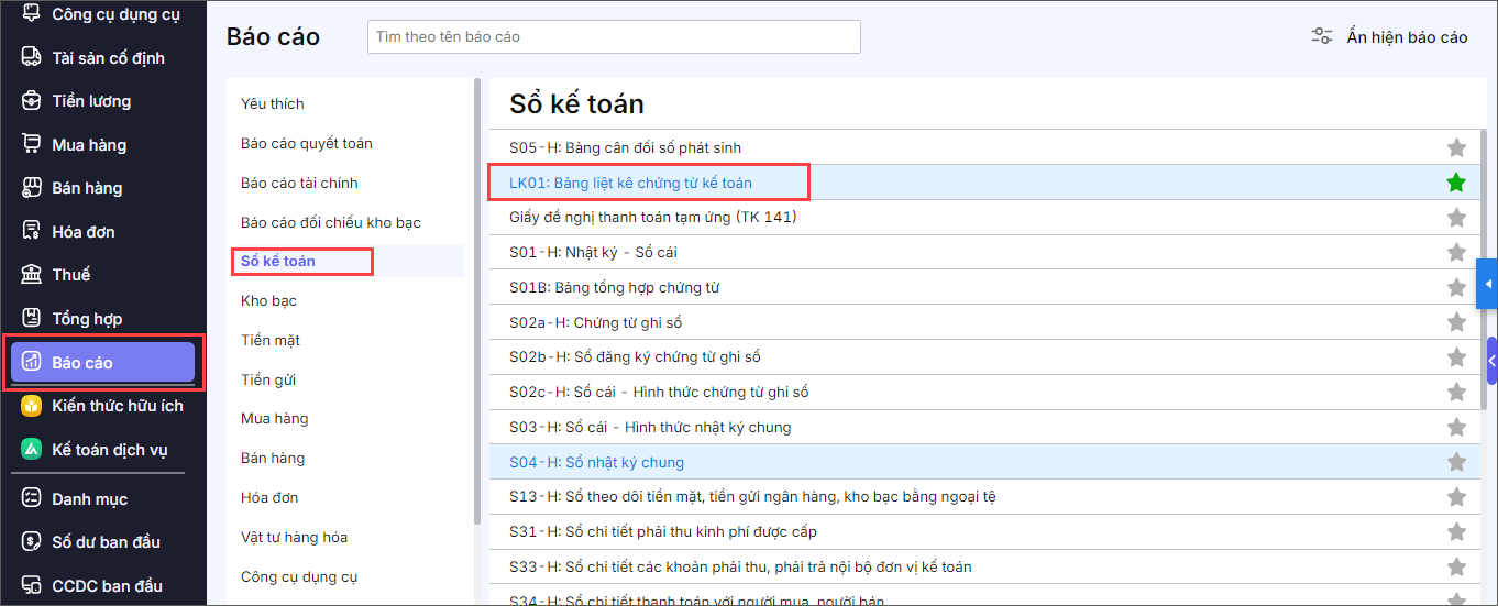 Bước 1: Vào menu Báo cáo\Sổ kế toán.