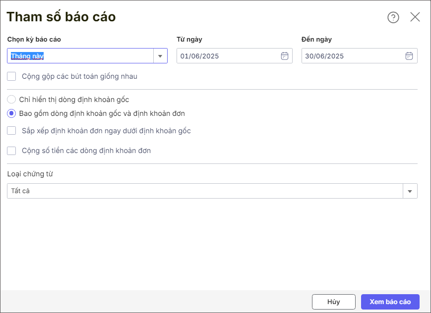 Bước 3: Khai báo tham số in và nhấn Xem báo cáo.