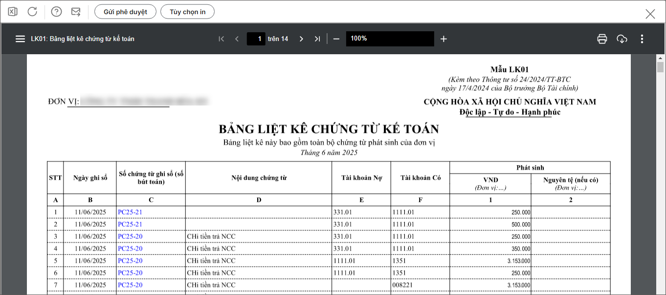 Lưu ý : Báo cáo mẫu LK01 trên chỉ liệt kê toàn bộ chứng từ phát sinh của đơn vị , không lấy chứng từ ghi sổ .