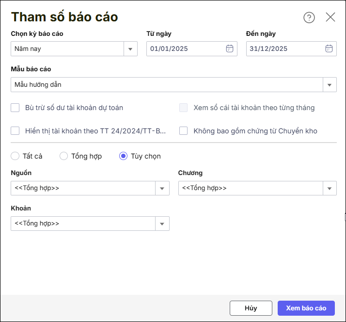 Bước 6: Khai báo tham số in và nhấn Xem báo cáo.