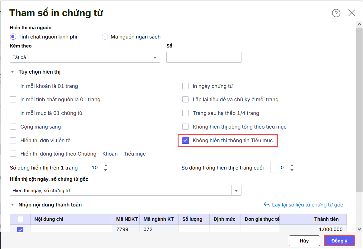 Bước 2 : Trên cửa sổ Tham số in chứng từ , anh/chị tích chọn Không hiển thị thông tin Tiểu mục.