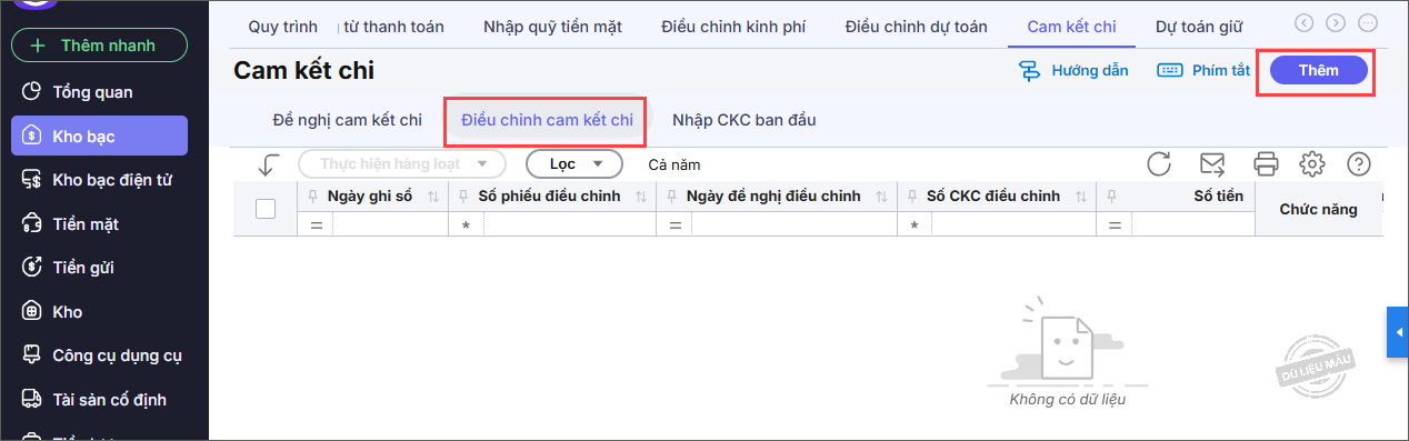 Bước 2: Chọn tab Điều chỉnh cam kết chi. Nhấn Thêm.
