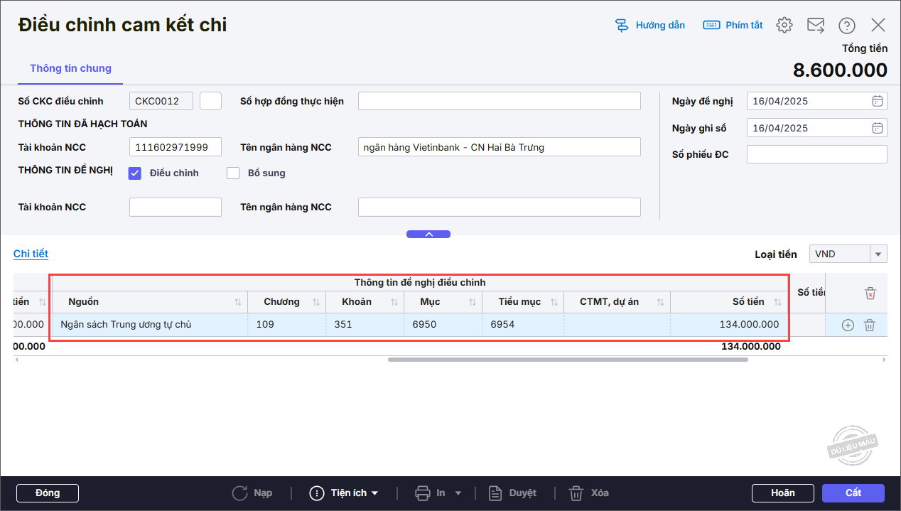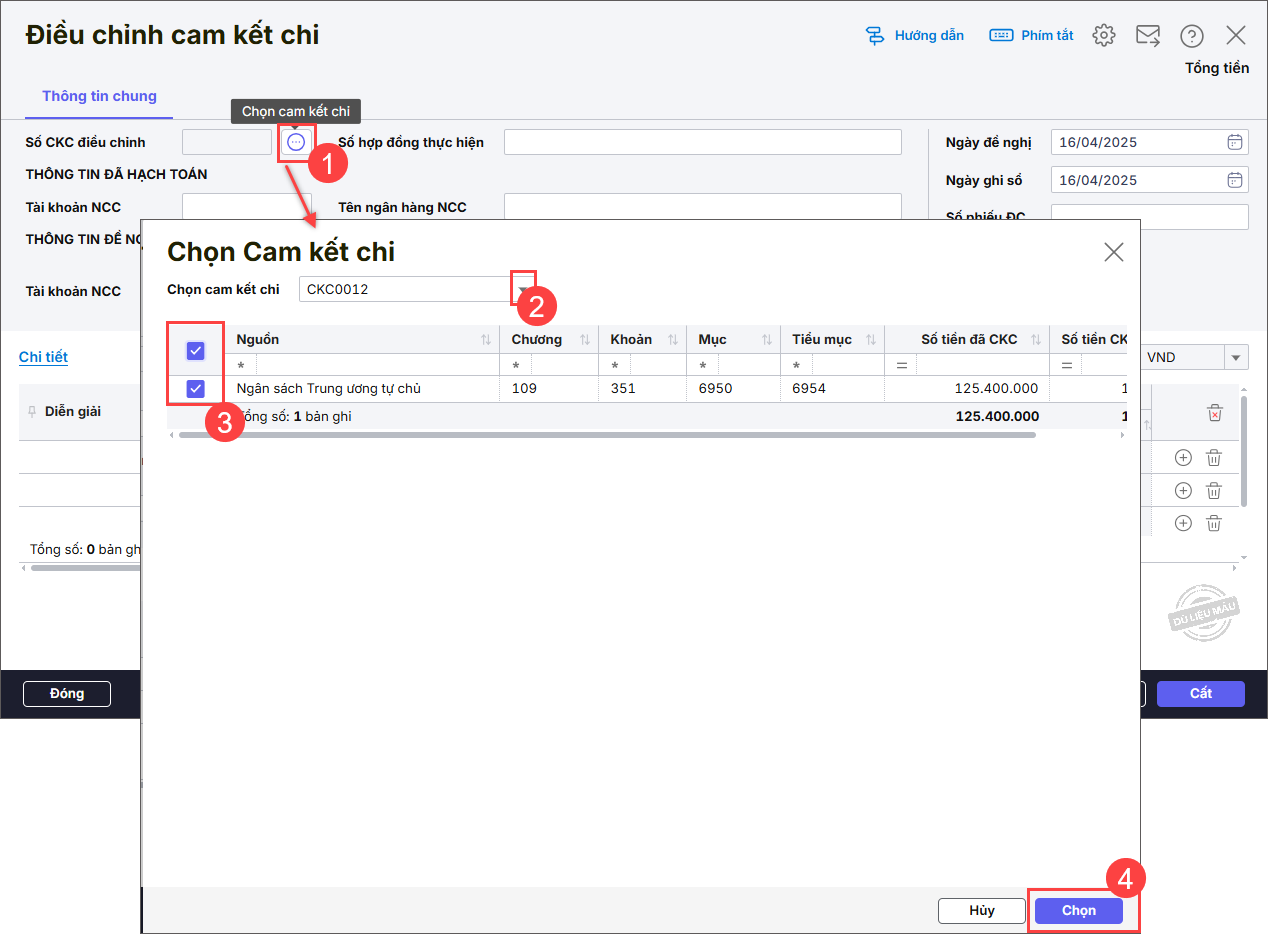 - Nhấn vào biểu tượng dấu ba chấm để chọn số cam kết chi điều chỉnh.