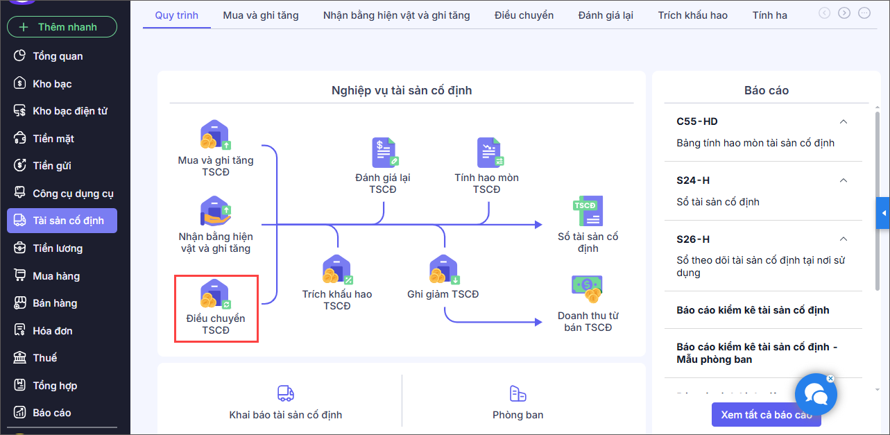 Bước 1: Vào Tài sản cố định\Quy trình \Điều chuyển TSCĐ, nhấn Điều chuyển tài sản cố định.