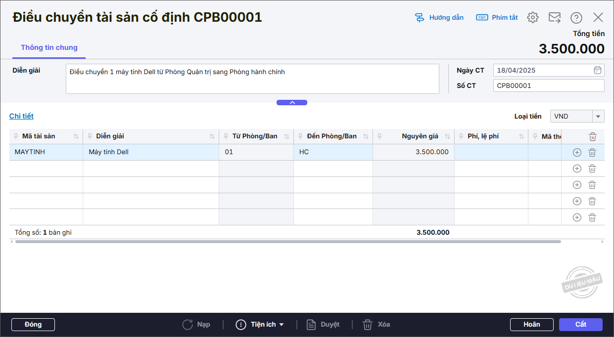 Bước 2: Khai báo thông tin chứng từ Điều chuyển tài sản cố định