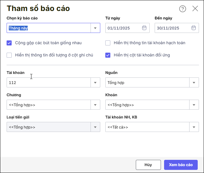 •  Chọn tài khoản là tài khoản 112 tổng hợp