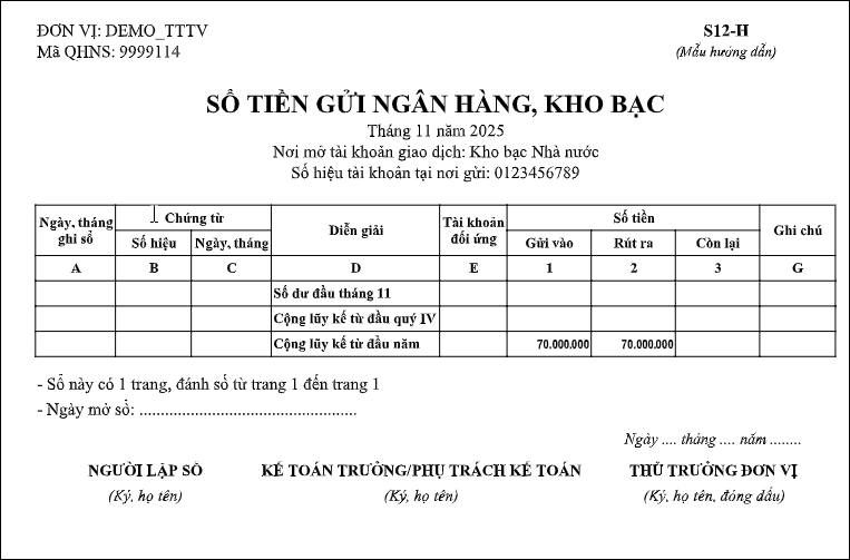 Bước 1: Vào Báo cáo\Tiền gửi\S12-H: Sổ tiền gửi Ngân hàng, Kho bạc để đối chiếu với Sổ phụ ngân hàng/Sao kê ngân hàng