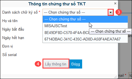Ở dòng Danh sách chữ ký số chọn lại chữ ký số mới, sau đó tích vào Lấy thông tin => Màn hình Mã pin hiện lên, bạn điền mã pin của chữ ký số.