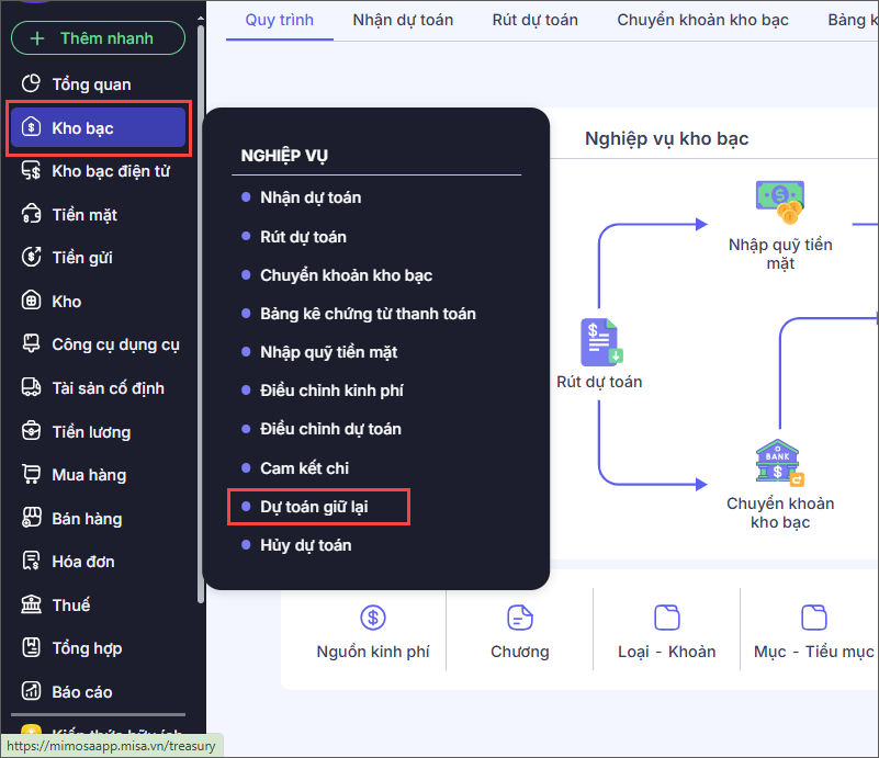 Bước 1: Vào nghiệp vụ Kho bạc\Dự toán giữ lại.