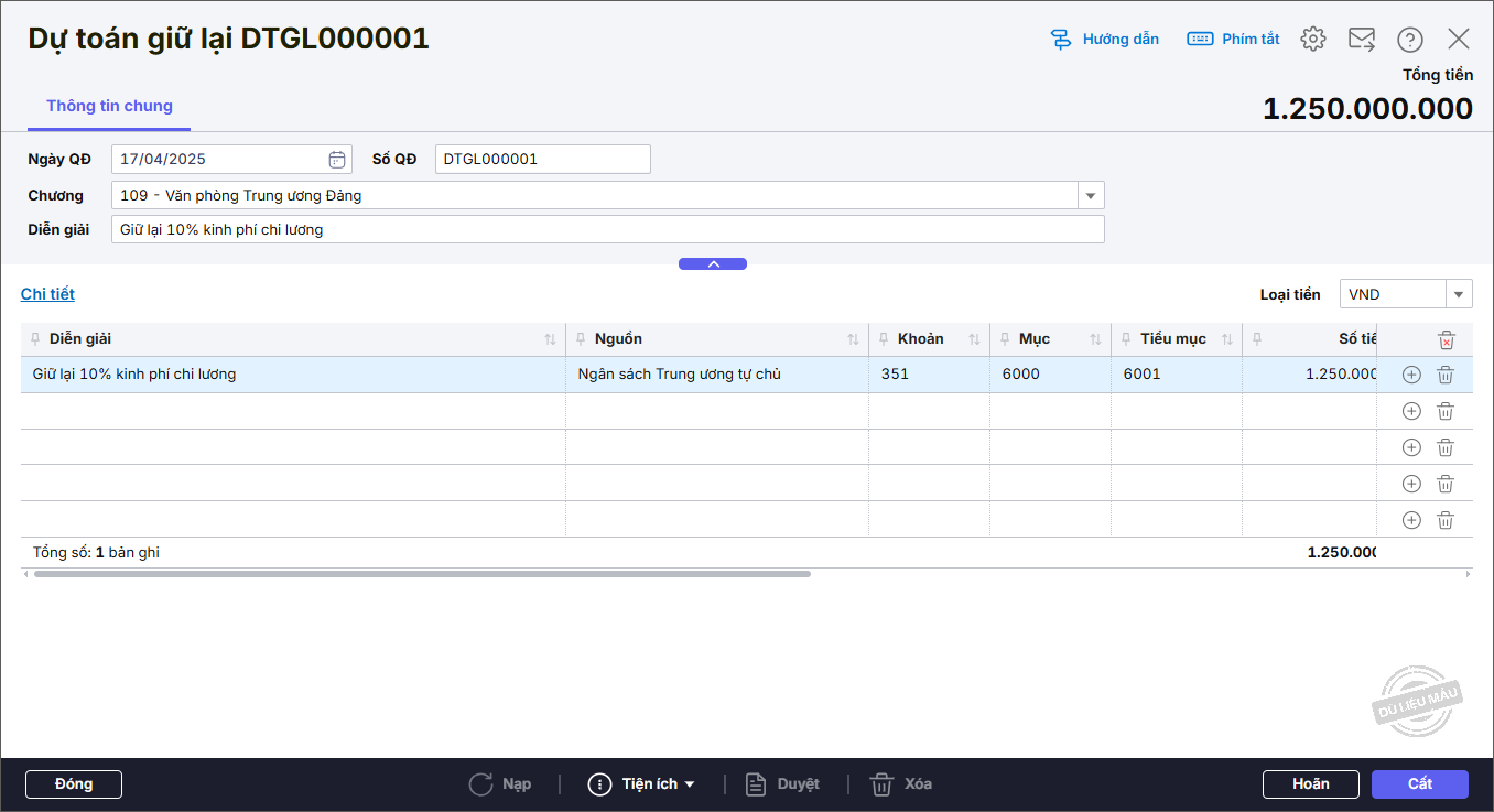 Bước 3: Khai báo thông tin trên chứng từ Dự toán giữ lại.