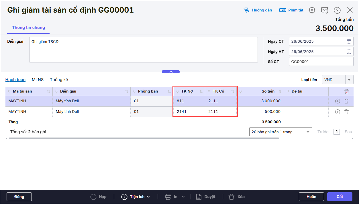 - Nhập thông tin chi tiết tại tab Hạch toán: chọn Mã tài sản cần ghi giảm. Nhập TK Nợ, TK Có, Số tiền.