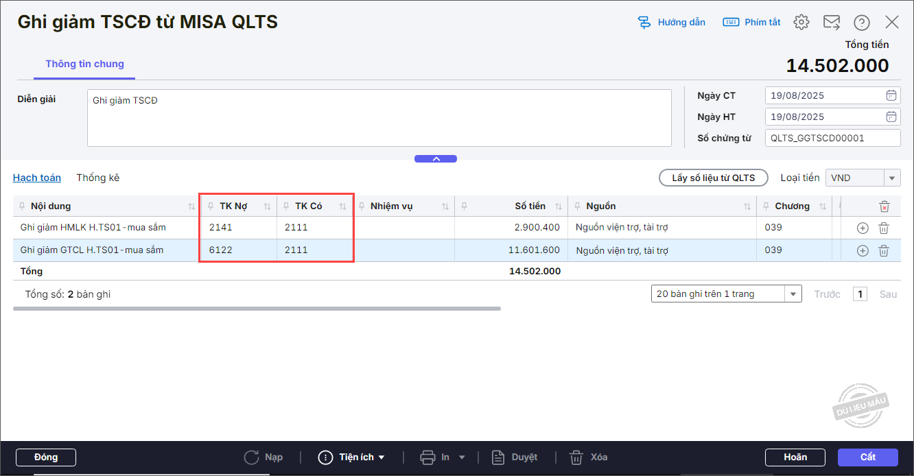 5. Mở chứng từ ghi giảm TSCĐ vừa lấy từ phần mềm QLTS để kiểm tra bút toán hạch toán đã đúng chưa. Nếu sai, nhấn Bỏ ghi\Sửa để sửa lại bút toán hạch toán cho phù hợp nguồn. Ví dụ như ở đây đổi lại thành Nợ TK 6122 nếu nguồn viện trợ, tài trợ có tính chất tự chủ và là đơn vị quản lý nhà nước.