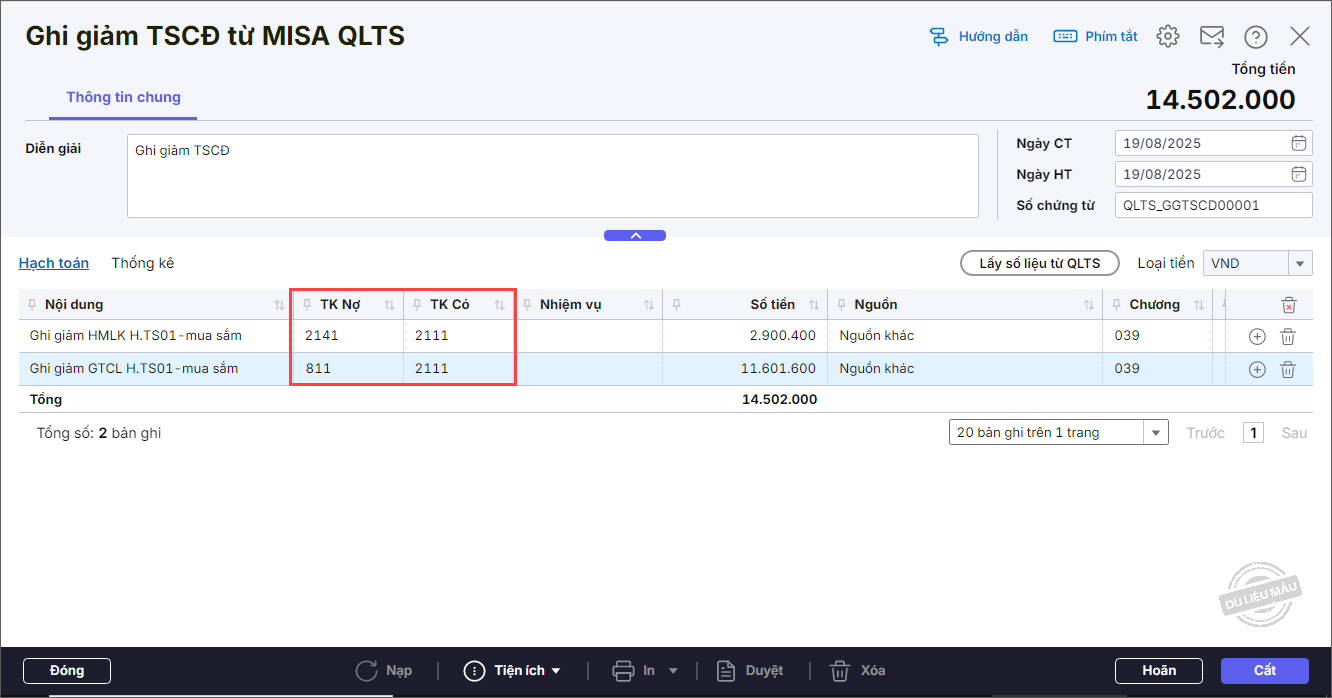 5. Anh/chị mở chứng từ ghi giảm TSCĐ vừa lấy từ phần mềm QLTS để kiểm tra bút toán hạch toán đã đúng chưa. Nếu sai, nhấn Bỏ ghi/Sửa để sửa lại bút toán hạch toán cho phù hợp với nguồn. Ví dụ như ở đây phần mềm đang hạch toán đúng.