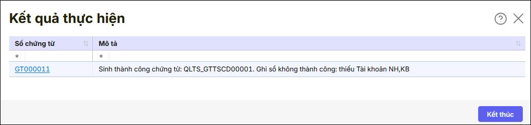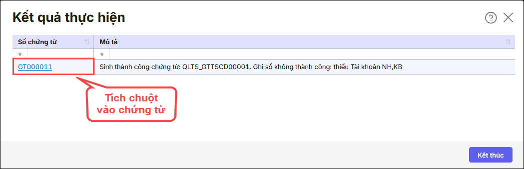 Bước 1: Trên kết quả thực hiện lấy chứng từ ghi tăng từ QLTS, bạn tích chuột vào chứng từ đang báo ghi sổ không thành công.
