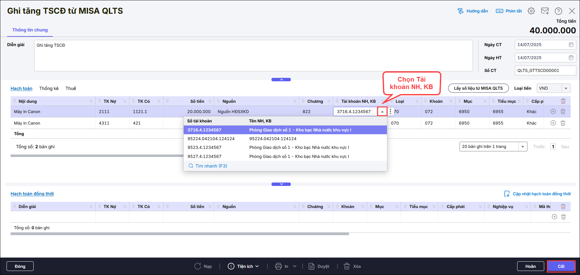 Bước 3: Chọn Tài khoản NH, KB trên giao diện chứng từ, rồi nhấn Cất.