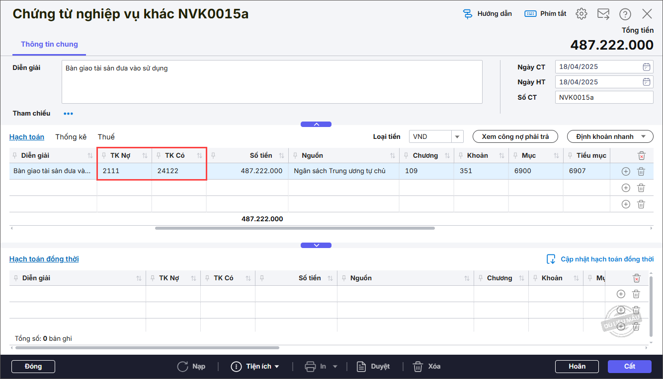 Bước 2: Khai báo các thông tin trên chứng từ Chứng từ nghiệp vụ khác.