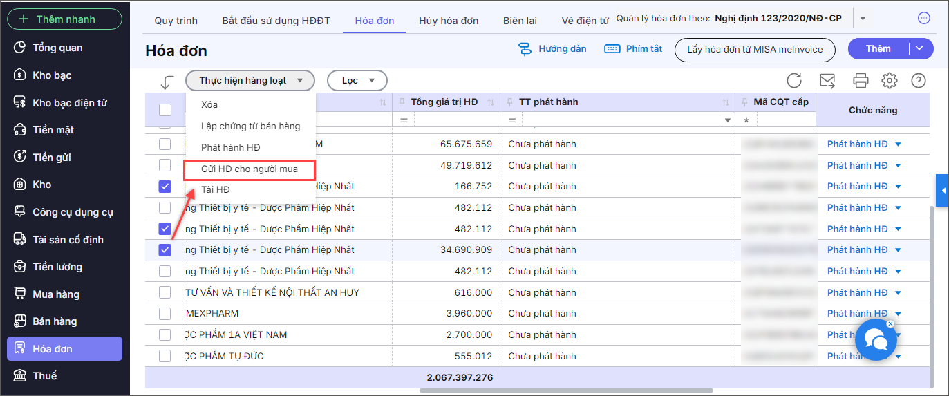 Bước 3: Nhấn Thực hiện hàng loạt\Gửi HĐ cho người mua.