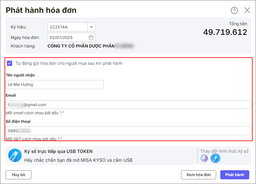 Khi Phát hành hóa đơn điện tử, tích chọn vào Tự động gửi hóa đơn cho người mua sau khi phát hành.