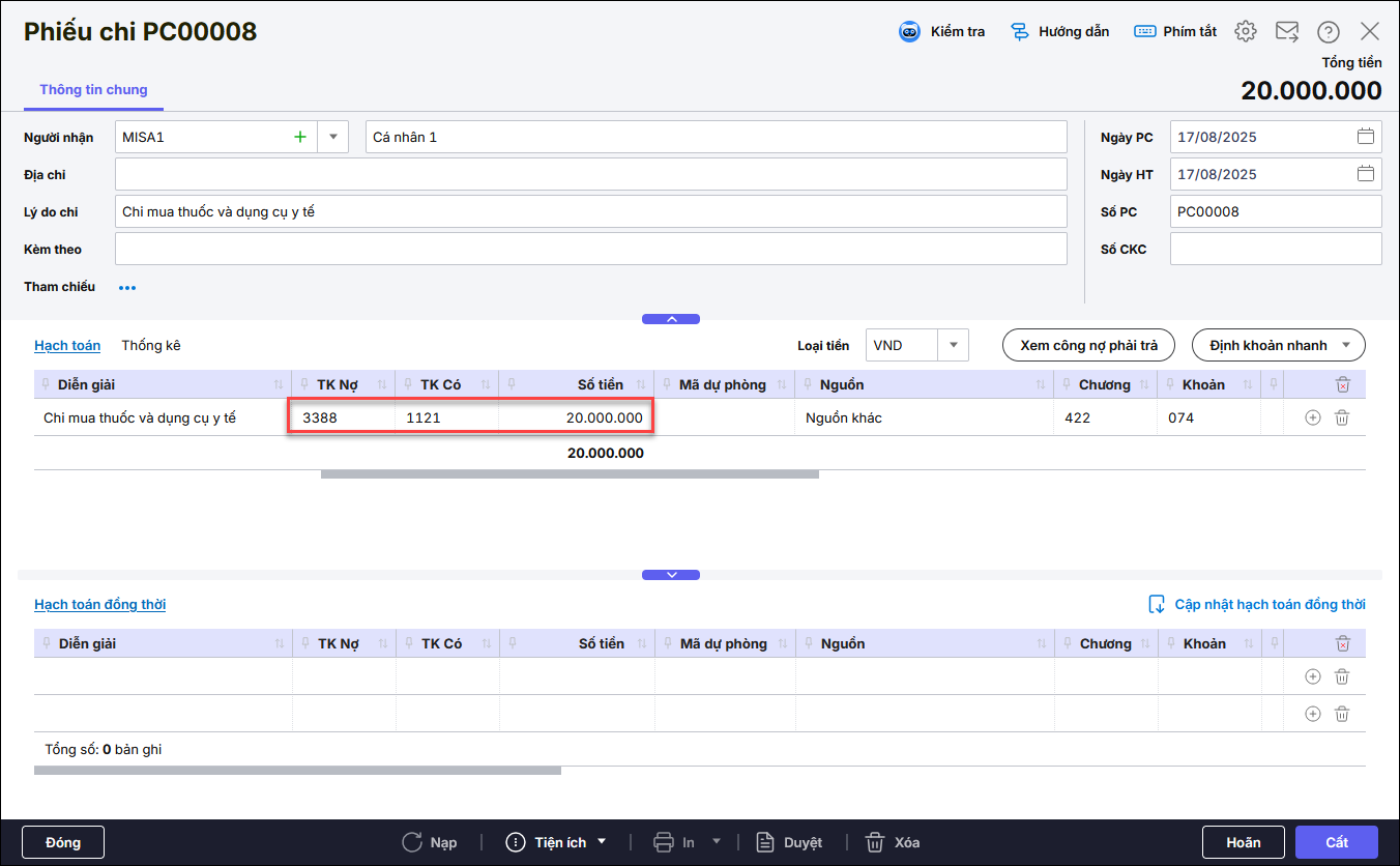 - Nhập chi tiết nội dung chứng từ , TK Nợ 3388, TK Có 1111, số tiền ,nguồn ,…