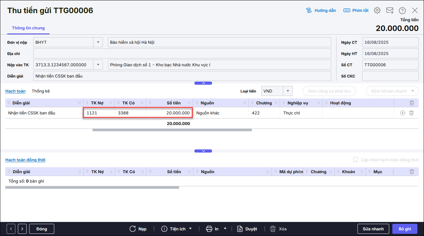 - Nhập chi tiết nội dung chứng từ , TK Nợ 1121, TK Có 3388 , số tiền ,nguồn ,… nghiệp vụ , thực chi .