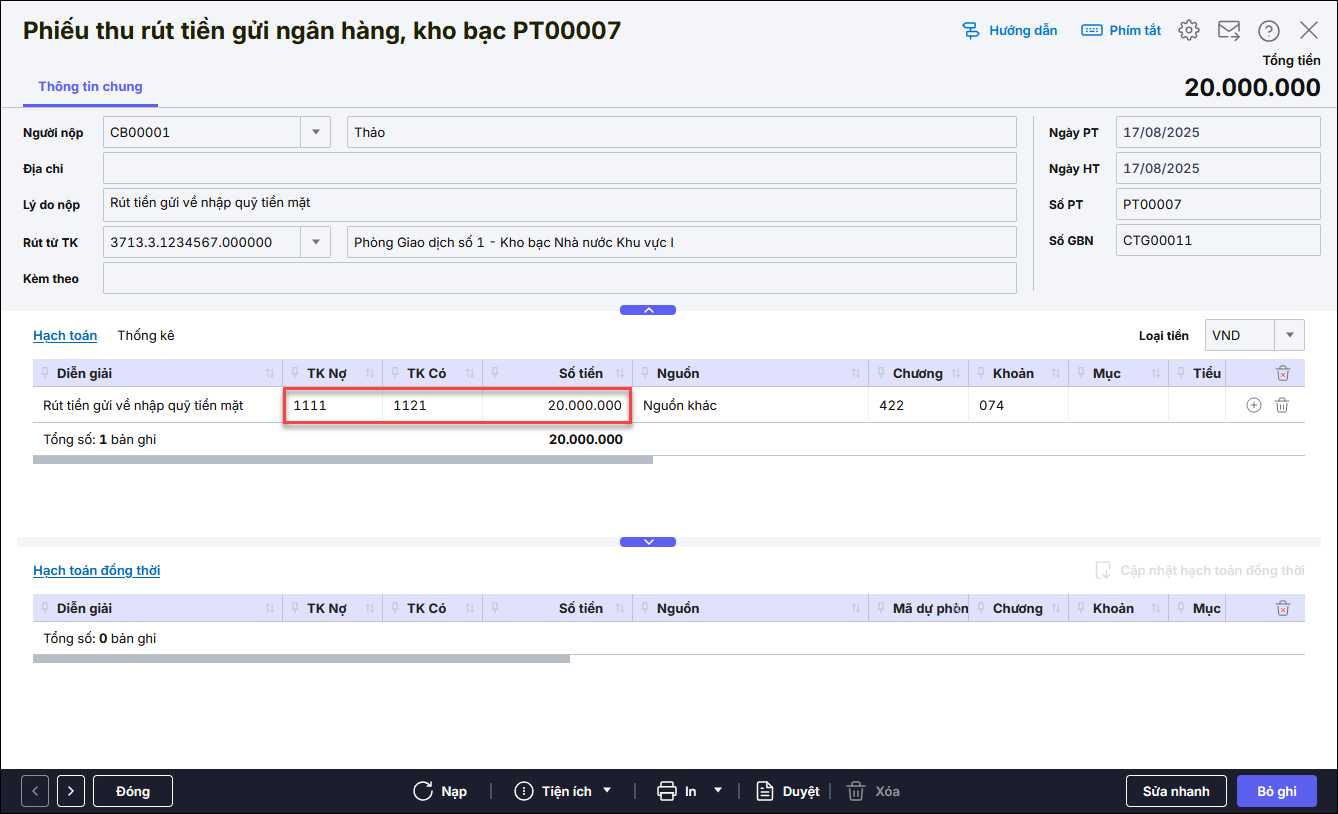 - Nhập chi tiết nội dung chứng từ , TK Nợ 1111, TK Có 1121 , số tiền ,nguồn ,…