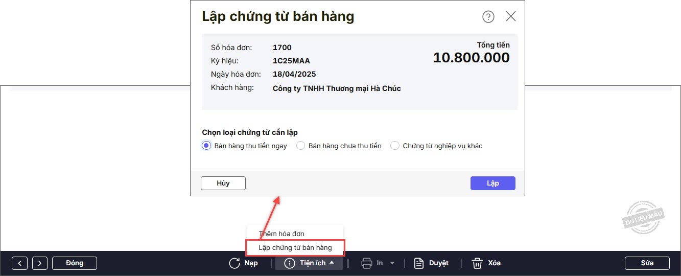 Bước 5: Lập chứng từ bán hàng bằng cách trên hóa đơn, nhấn vào mũi tên cạnh Tiện ích\Lập chứng từ bán hàng.