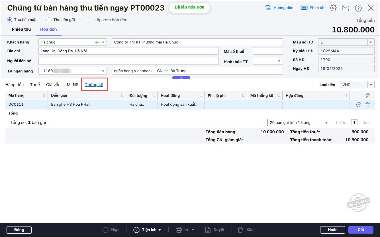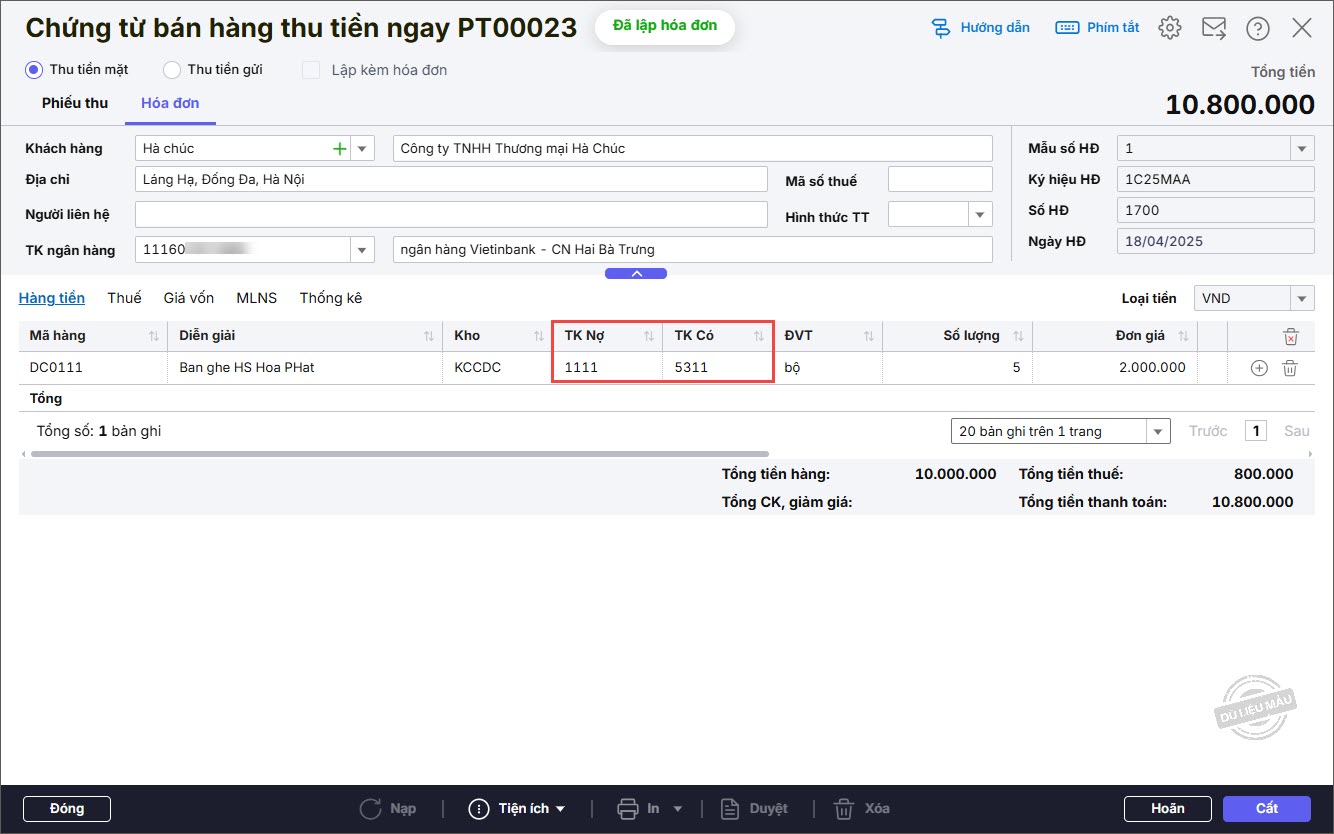 Cách 1: Lập chứng từ bán hàng từ 1 hóa đơn