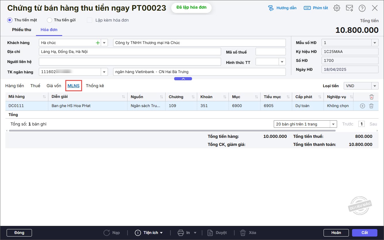 Bước 8: Chọn tab MLNS và khai báo thêm các thông tin MLNS: