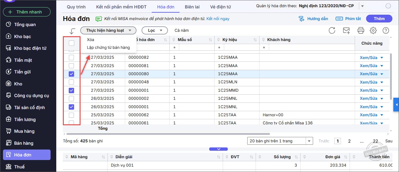 Bước 3: Nhấn Thực hiện hàng loạt, chọn Lập chứng từ bán hàng.