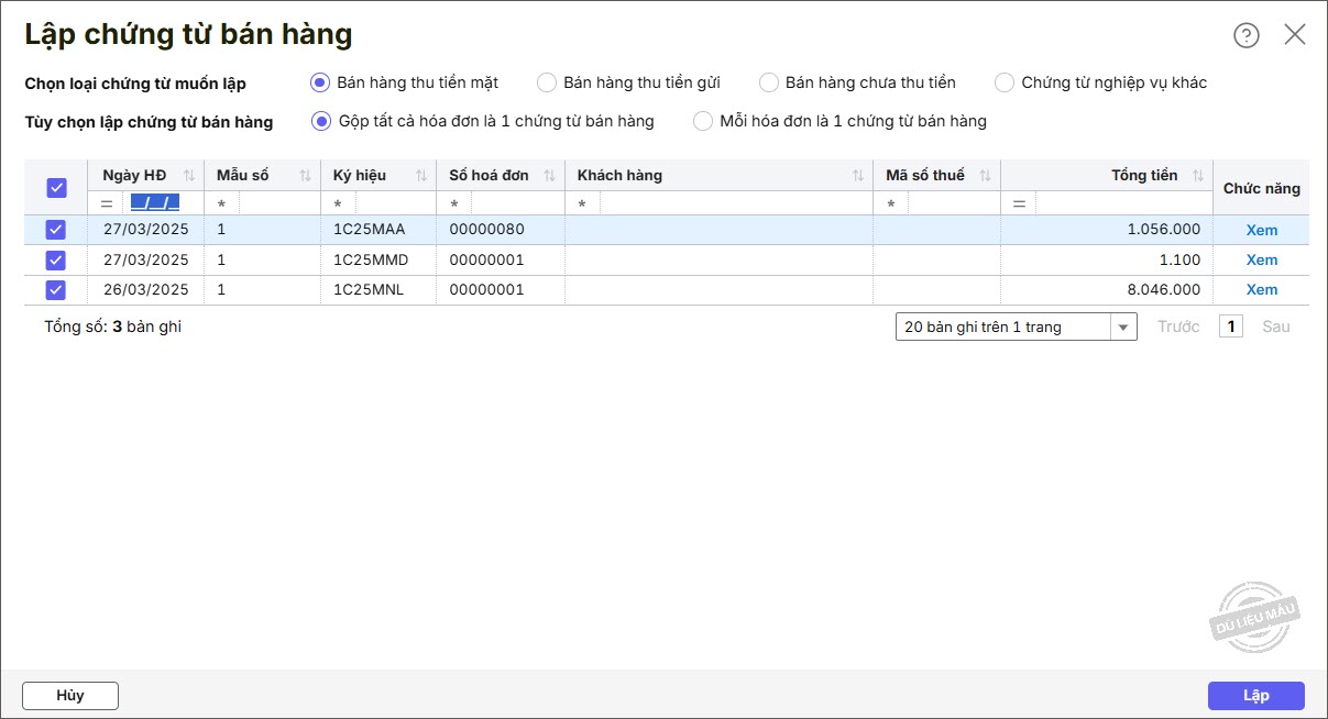 Bước 6: Phần mềm tự động tích chọn loại chứng từ muốn lập dựa trên Hình thức thanh toán trên hóa đơn (có thể chọn lại loại chứng từ cần lập là Bán hàng thu tiền ngay, bán hàng chưa thu tiền, chứng từ nghiệp vụ khác nếu muốn thay đổi ). Nhấn Lập.