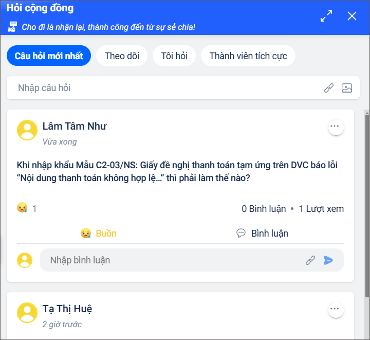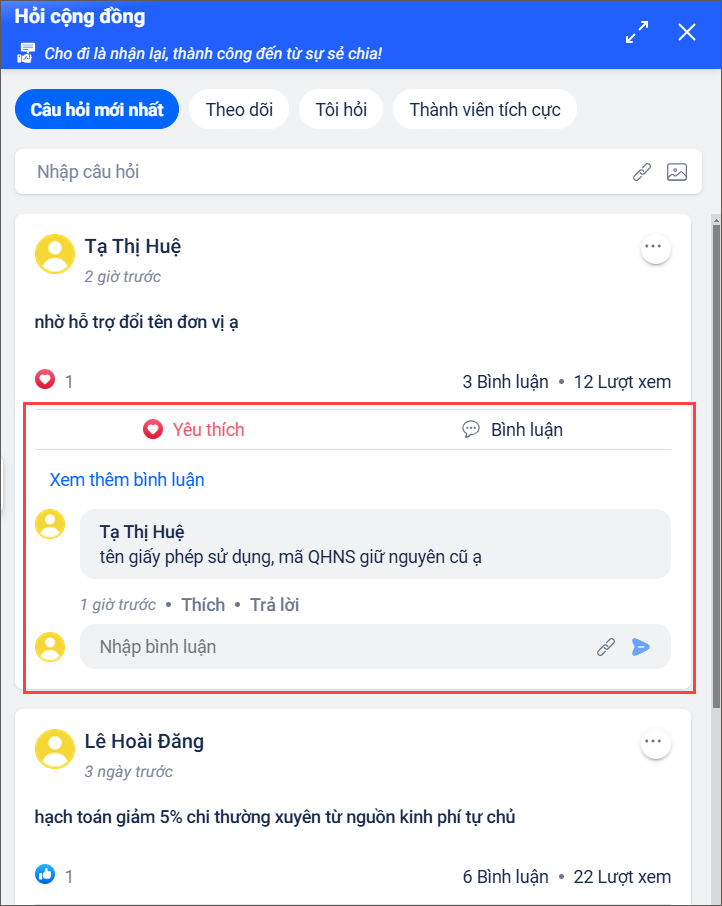 - Bài viết sẽ hiển thị trong danh sách câu hỏi của cộng đồng. Nhân viên MISA và các người dùng phần mềm Mimosa Online khác có thể xem, bình luận hoặc hỗ trợ trực tiếp.