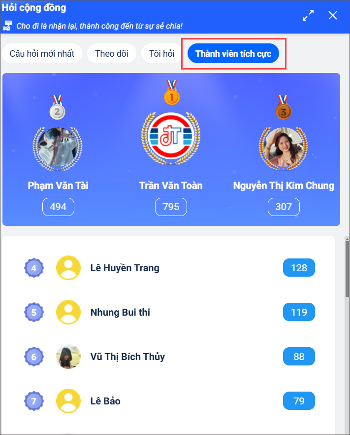 - Anh/chị có thể theo dõi các thành viên có đóng góp tích cực trong cộng đồng tại mục Thành viên tích cực.