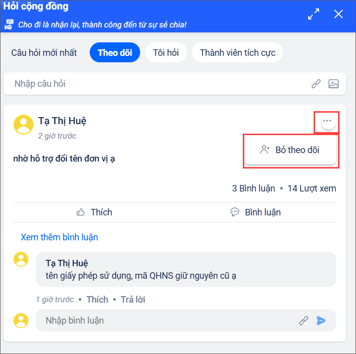 - Trong trường hợp anh/chị không muốn theo dõi bài viết này nữa thì nhấn vào biểu tượng 3 chấm, sau đó chọn Bỏ theo dõi.