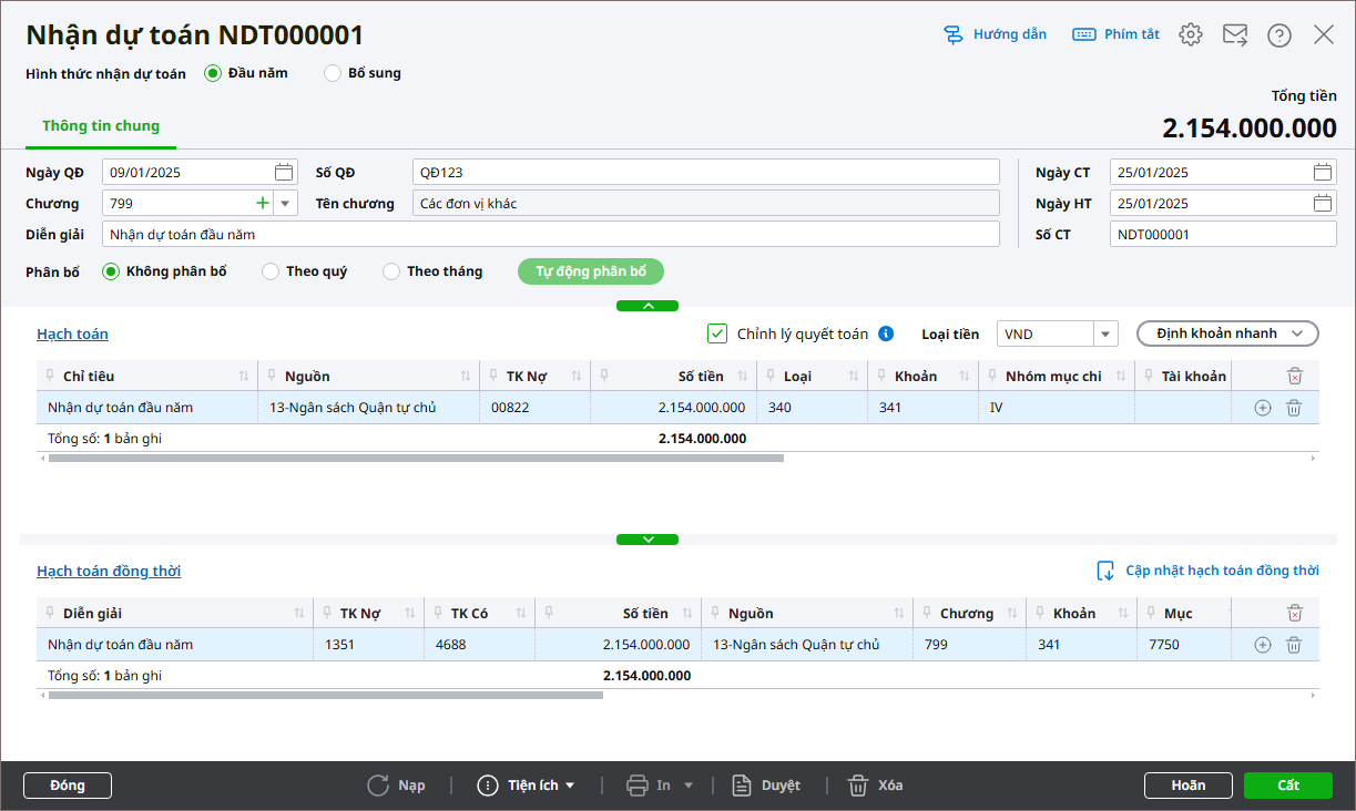 - Bước 2: Chọn Hình thức nhận dự toán là Đầu năm.