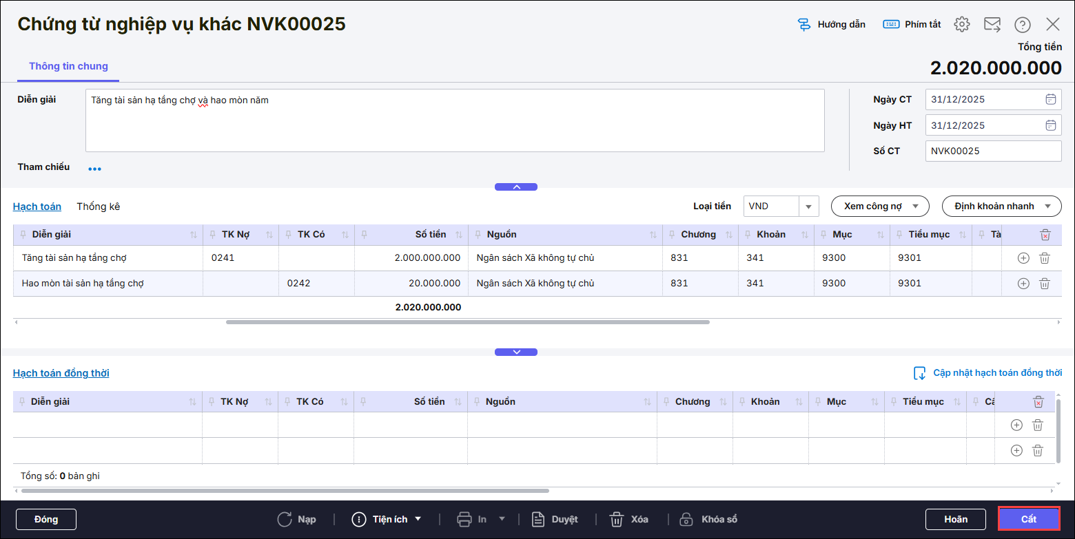 Nhập các bút toán hạch toán phát sinh trong năm liên quan đến tài sản kết cấu hạ tầng đơn vị quản lý nhưng không trực tiếp khai thác sử dụng theo phần Định khoản ở mục 3. Định khoản