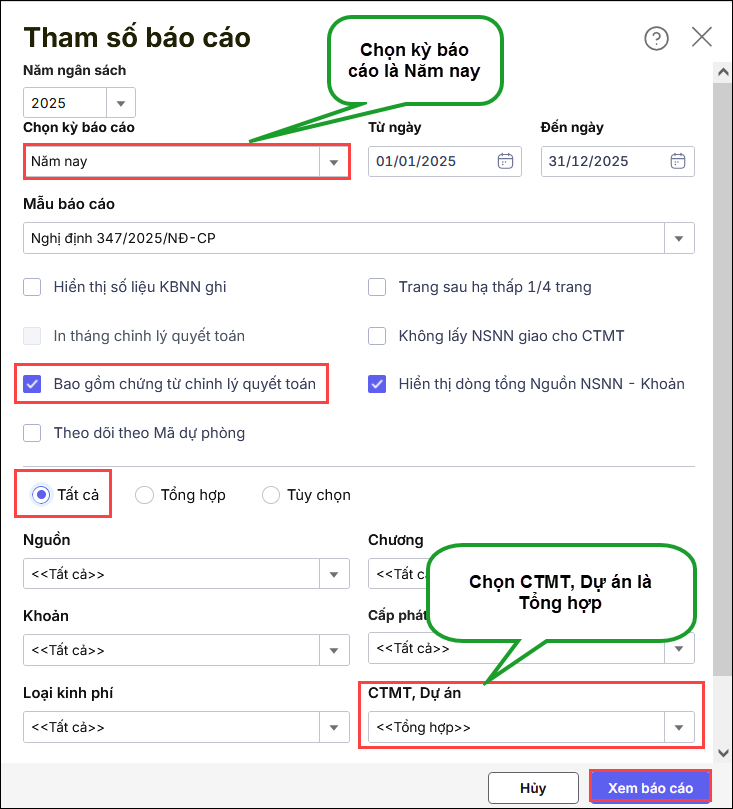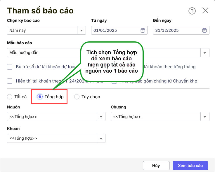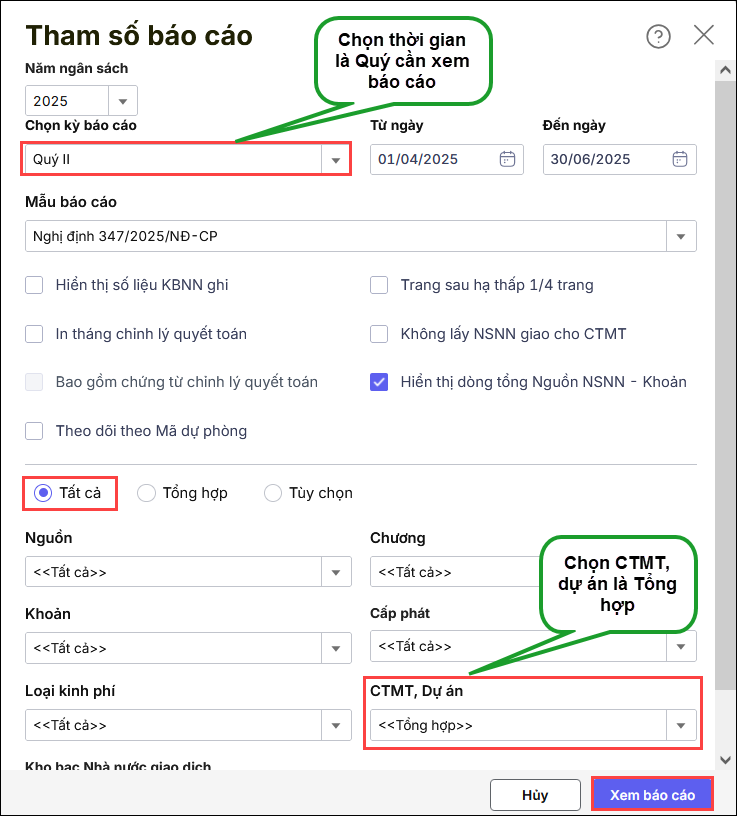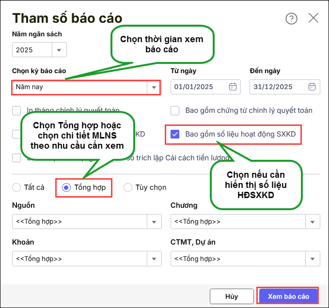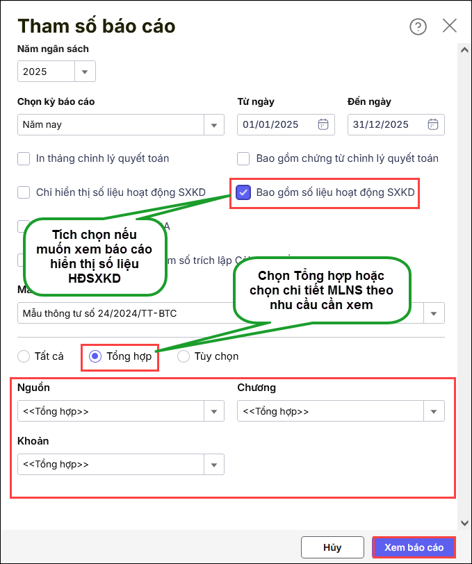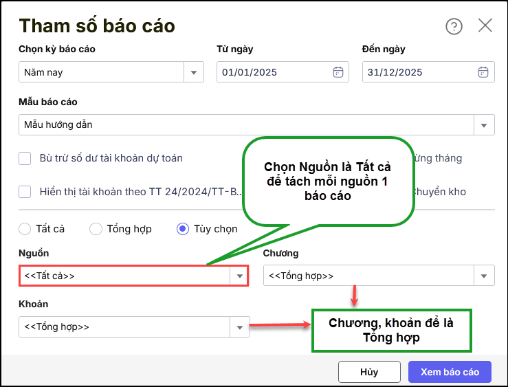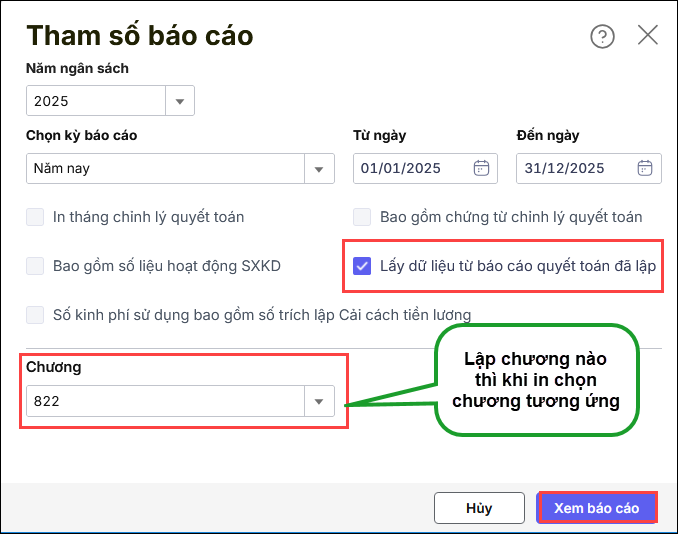 Bước 2: Chọn tham số in báo cáo phù hợp