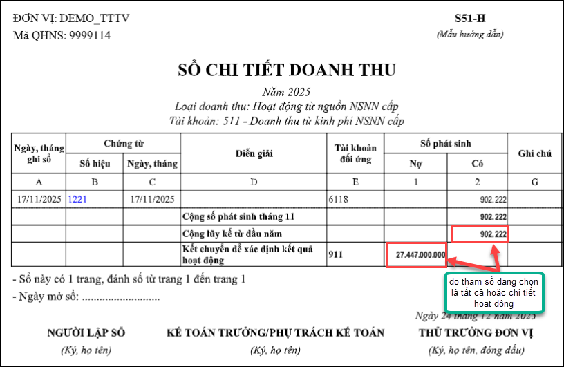 Trường hợp khi xem báo cáo số Kết chuyển để xác định kết quả hoạt động không bằng với cộng phát sinh. Anh/chị thực hiện chọn lại tham số Loại doanh thu là Tổng hợp do trên chi tiết chứng từ đang không chọn hoạt động. Và phải có bút toán Xác định kết quả hoạt động thì mới lên số liệu dòng này.