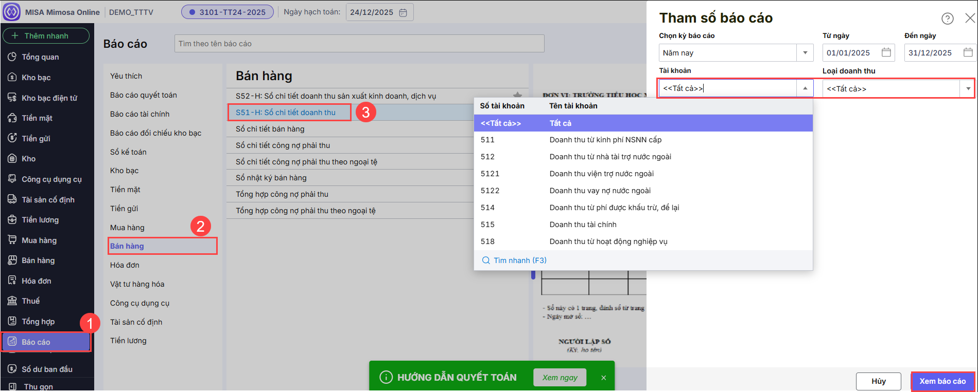 Bước 1: Vào Báo cáo\Bán hàng\Kích đúp chuột vào S51-H: Sổ chi tiết doanh thu