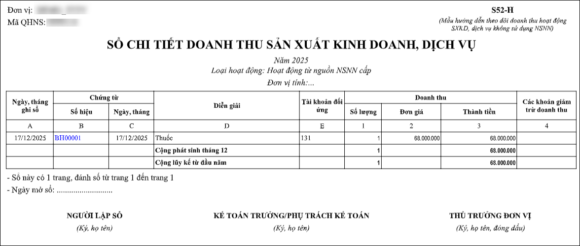 Bài viết này hướng dẫn anh/chị cách in sổ S52-H: Sổ chi tiết doanh thu sản xuất kinh doanh, dịch vụ để theo dõi doanh thu của hoạt động sản xuất kinh doanh, dịch vụ; bao gồm cả phần do đơn vị trực tiếp thu và kinh phí cung cấp cho hoạt động dịch vụ sự nghiệp công từ NSNN đối với hoạt động dịch vụ sự nghiệp công sử dụng ngân sách
