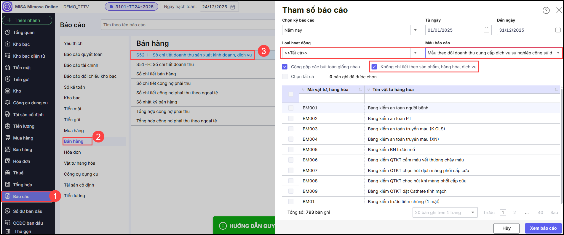 Bước 1: Vào Báo cáo\Bán hàng\Kích đúp chuột vào S52-H: Sổ chi tiết doanh thu sản xuất kinh doanh, dịch vụ