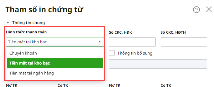 Ví dụ: Chọn Hình thức thanh toán bằng cách nhấn vào dấu mũi tên ⏷, sau đó chọn 1 trong 3 hình thức là Chuyển khoản, Tiền mặt tại kho bạc hoặc Tiền mặt tại ngân hàng.