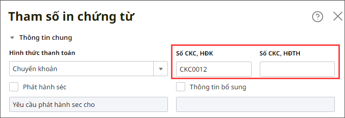 Bước 2: Ở màn hình tham số in chứng từ, chọn hoặc nhập các tham số theo nhu cầu