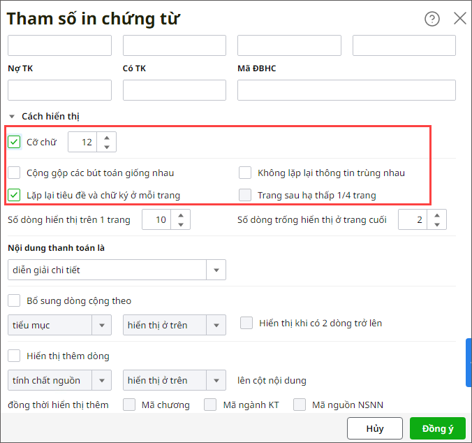 - Nếu tích chọn Tuỳ chọn thì anh/chị chọn các tham số theo nhu cầu in của đơn vị.