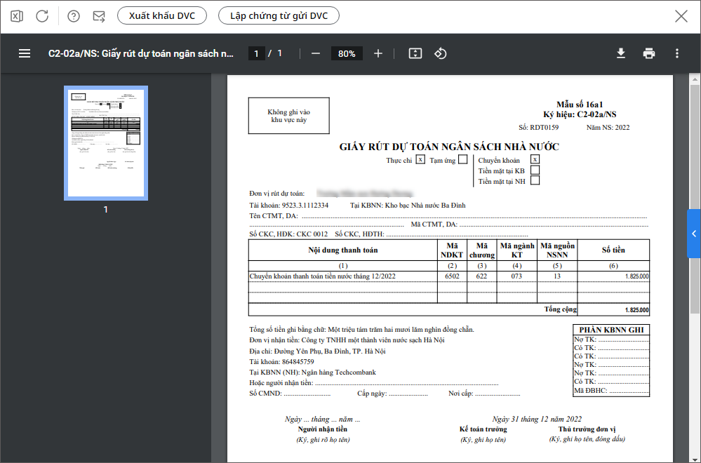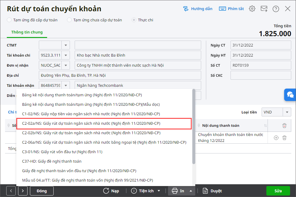 Bước 1: Sau khi lập xong chứng từ, nhấn In. Ví dụ in mẫu C2-02a/NS: Giấy rút dự toán ngân sách nhà nước.