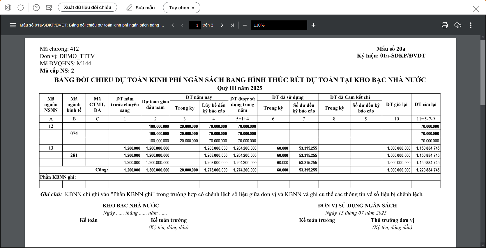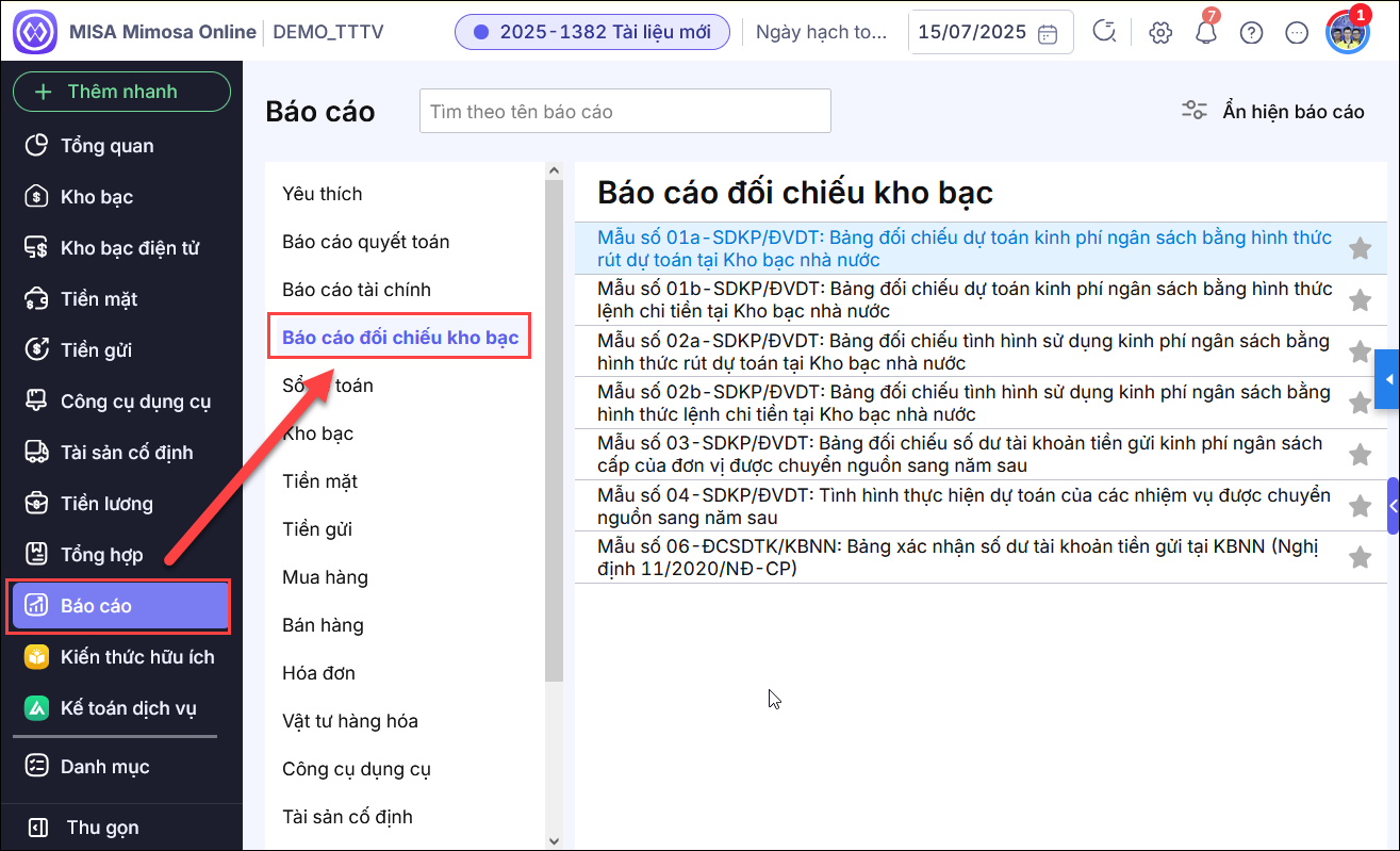 Bước 2: Kích đúp chuột vào báo cáo cần in. Ví dụ in Mẫu số 01a: Bảng đối chiếu dự toán kinh phí ngân sách bằng hình thức rút dự toán tại Kho bạc nhà nước.