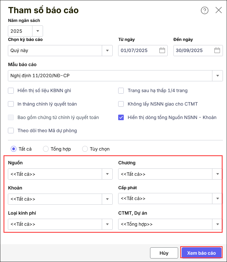 - Nếu tích chọn Tất cả thì các thông tin Nguồn, Chương, Khoản, Cấp phát, Loại kinh phí sẽ mặc định là Tất cả.