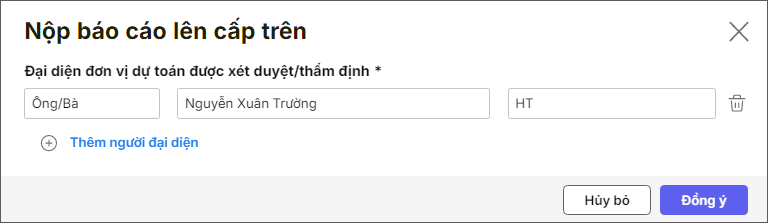 - Nhập thông tin Đại diện đơn vị dự toán được xét duyệt/thẩm định. Nhấn Đồng ý.