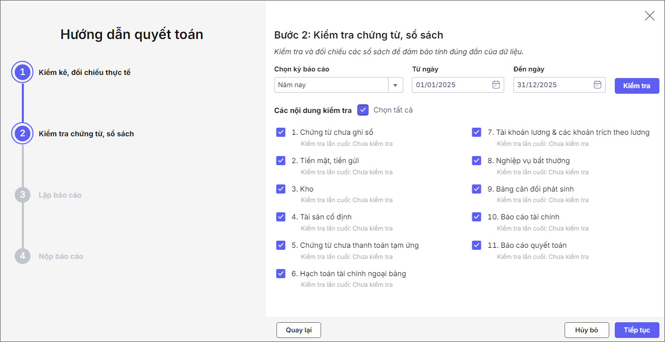Bước 2: Tại màn hình Hướng dẫn quyết toán, nhấn Tiếp tục để chuyển sang Bước 2: Kiểm tra chứng từ, sổ sách.
