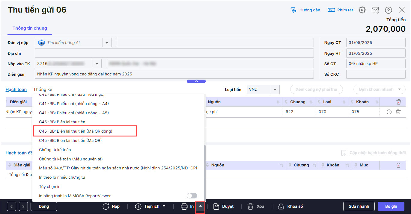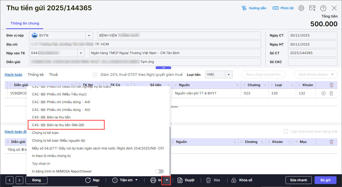 Bước 1: Trên chứng từ Thu tiền gửi, nhấn In và chọn Biên lai thu tiền (Mã QR).
