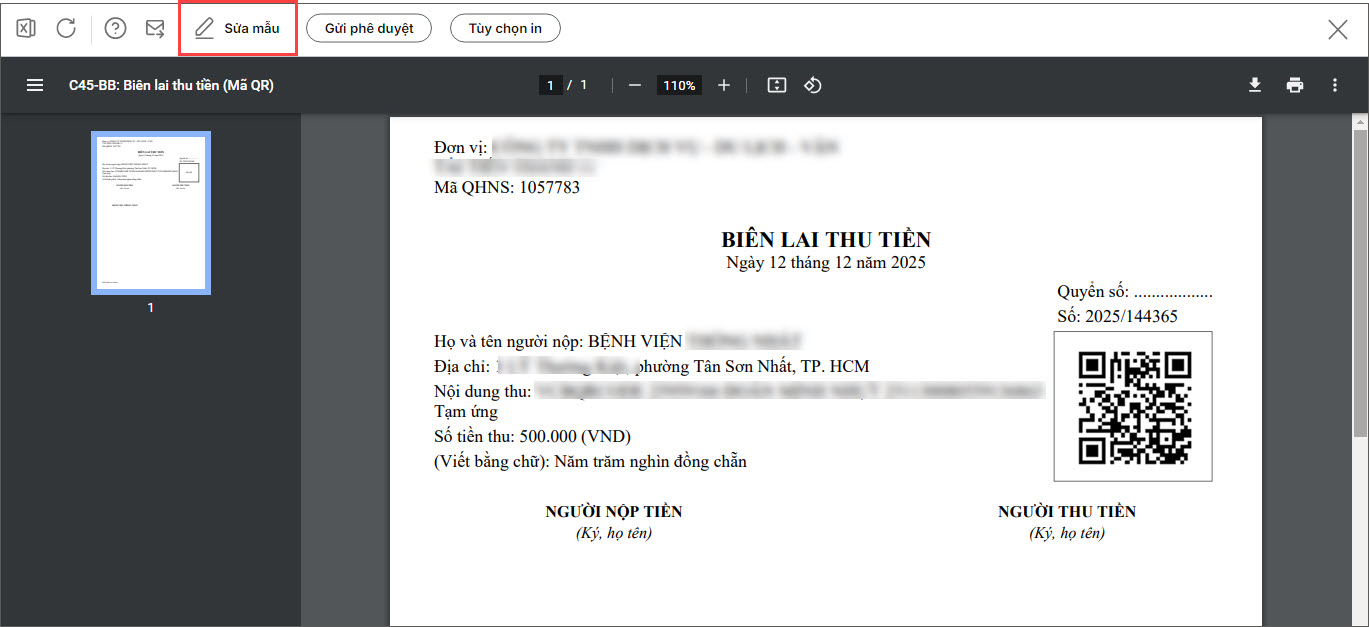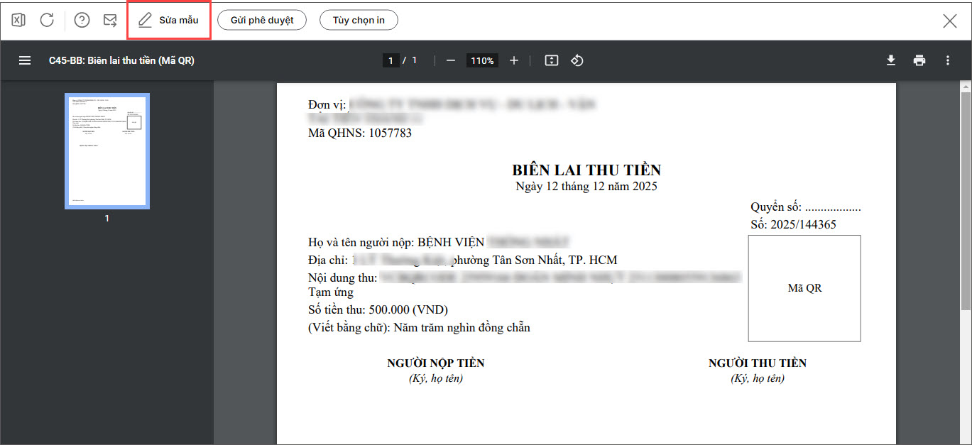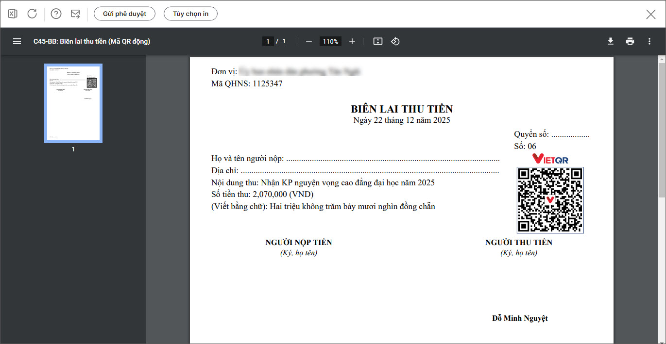 Trường hợp 2: In Biên lai thu tiền kèm mã QR động